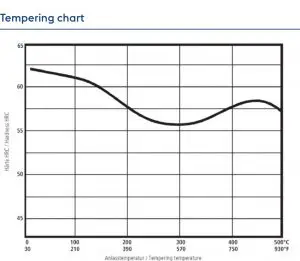 Revenido 100 a 200C. Para conseguir la dureza de trabajo deseada después del endurecimiento; consulte el diagrama de revenido. Caliente el material lentamente y atempere una vez durante 1 hora/20 mm de espesor del material, pero al menos 2 horas. Después del paso de tratamiento térmico, el material debe enfriarse a aprox. 30°C [86°F].